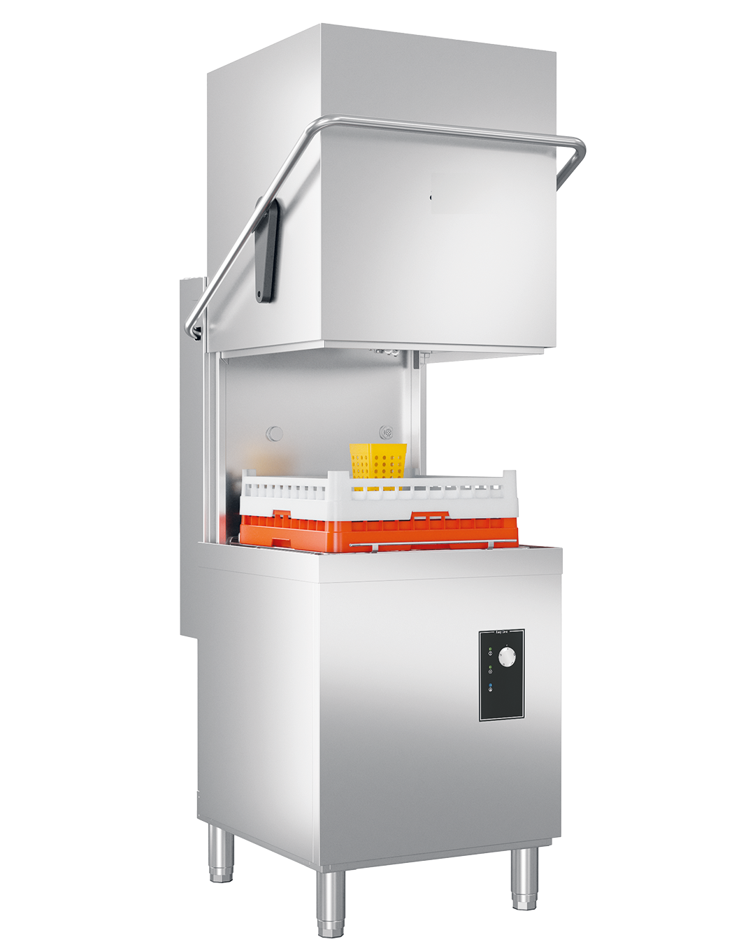 Lavavajillas de capota profesional, construido en acero inoxidable, diseñado para uso gastronómico intensivo.