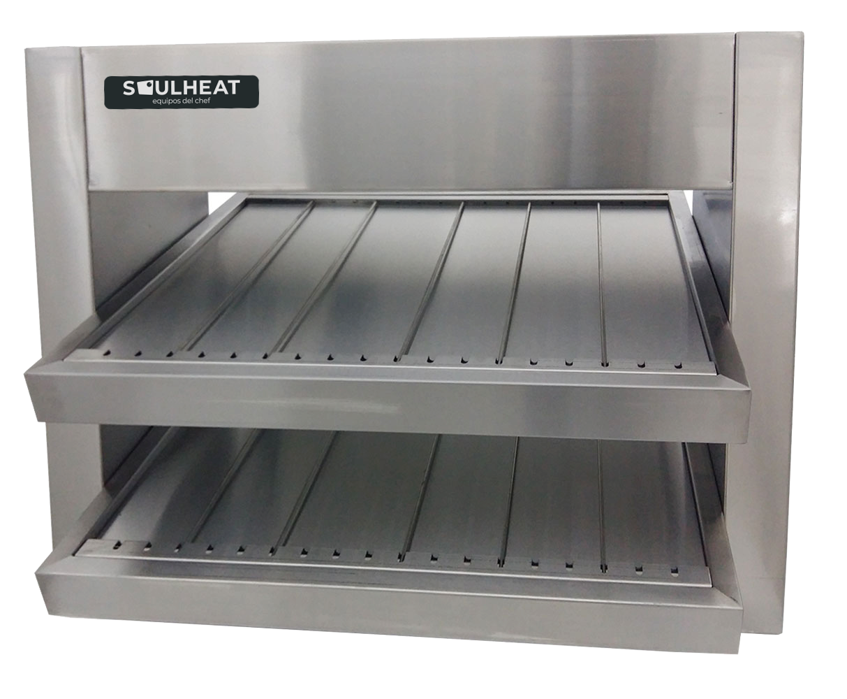 - Cuenta con dos niveles de exhibición con bandejas de acero inoxidable y separadores con varilla del mismo material con variador de posición.